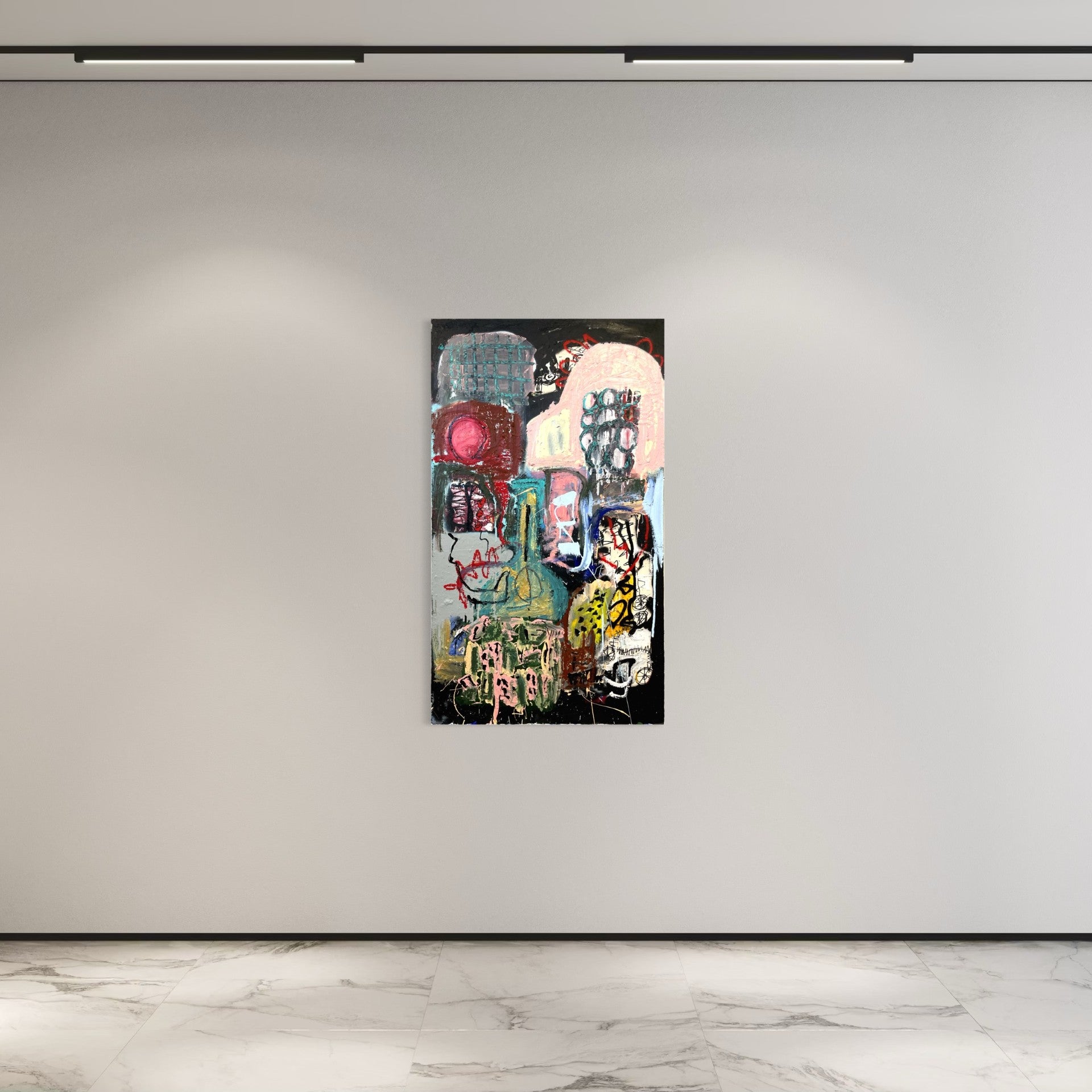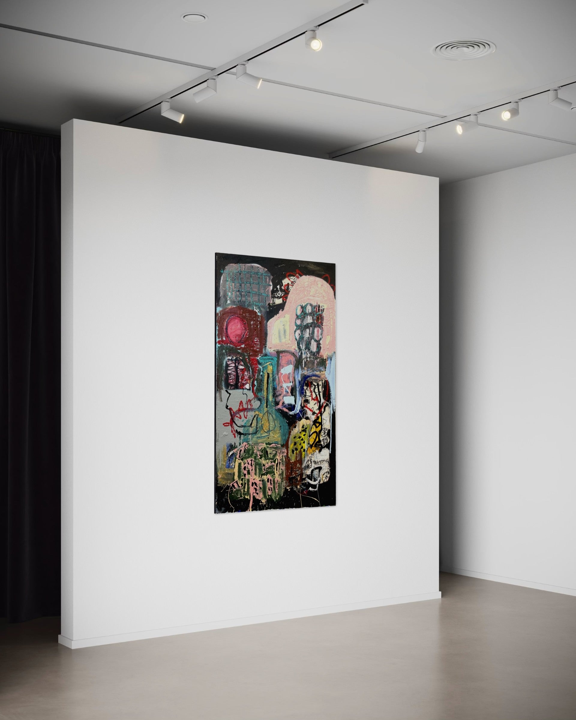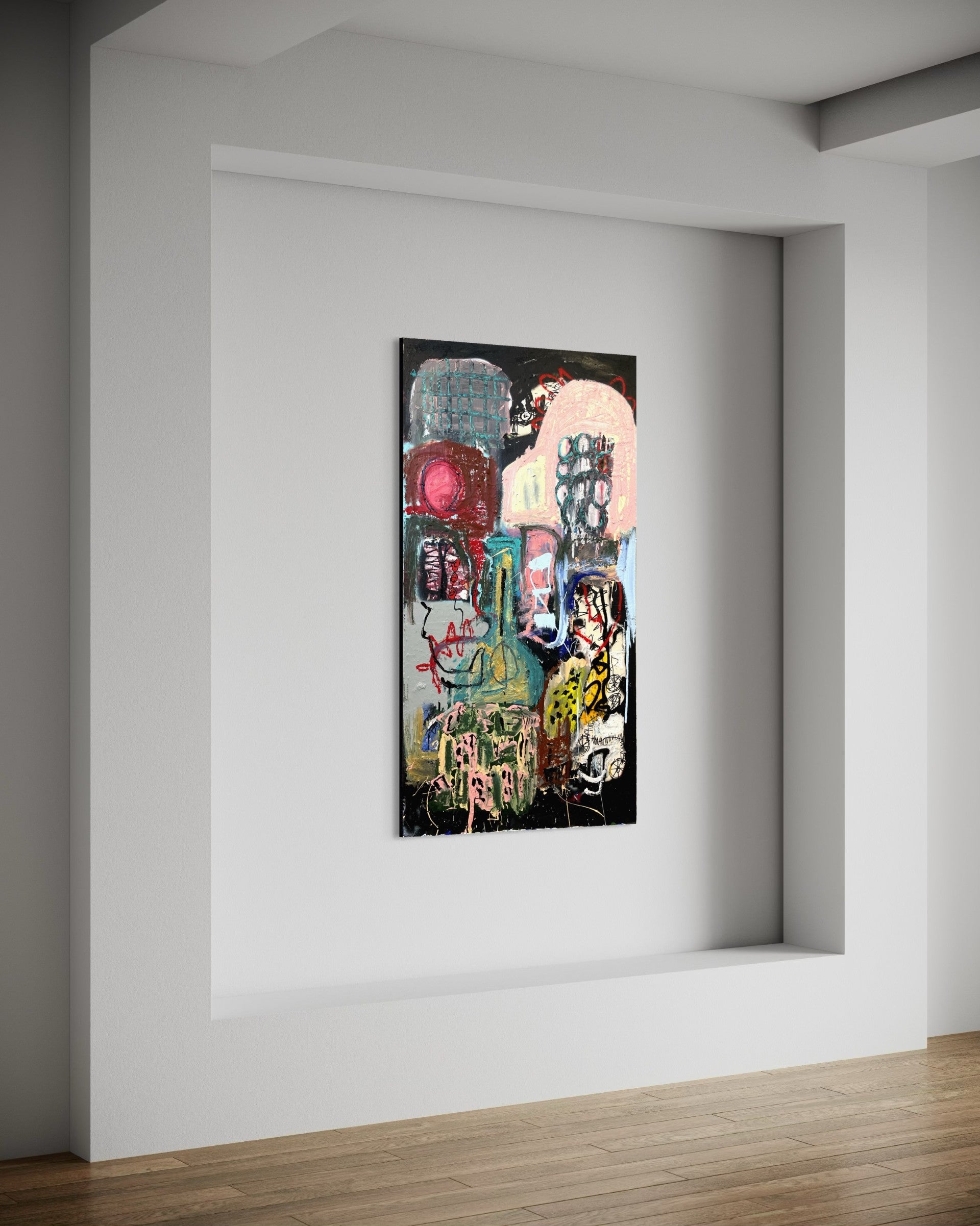 Oil, acrylic, pastels, and spray paint on canvas.