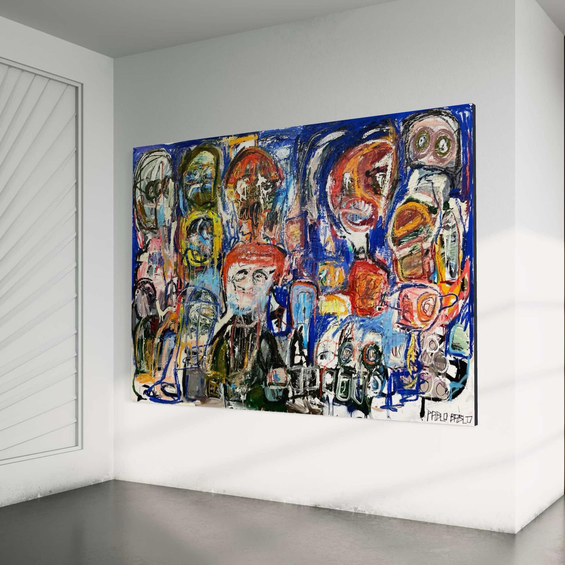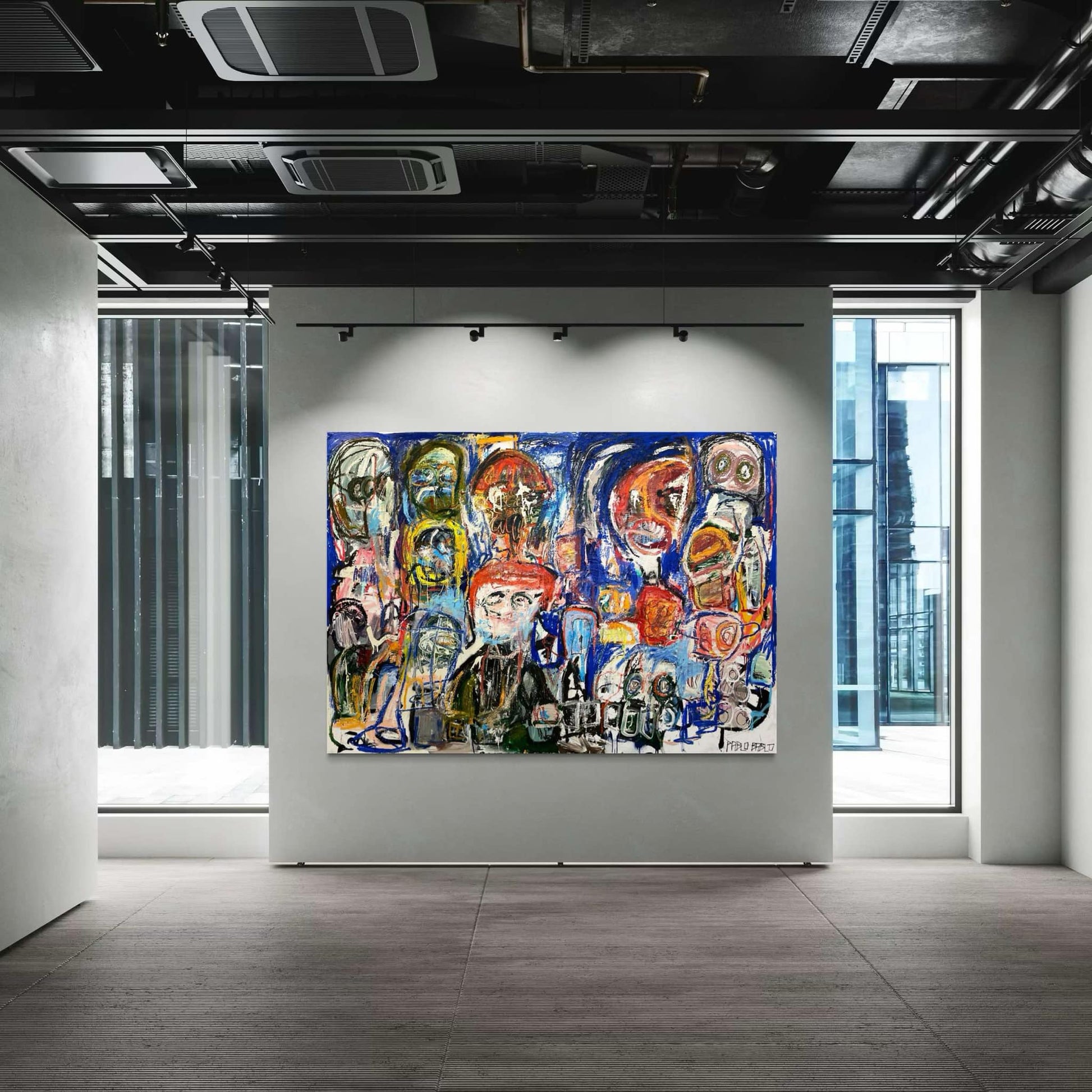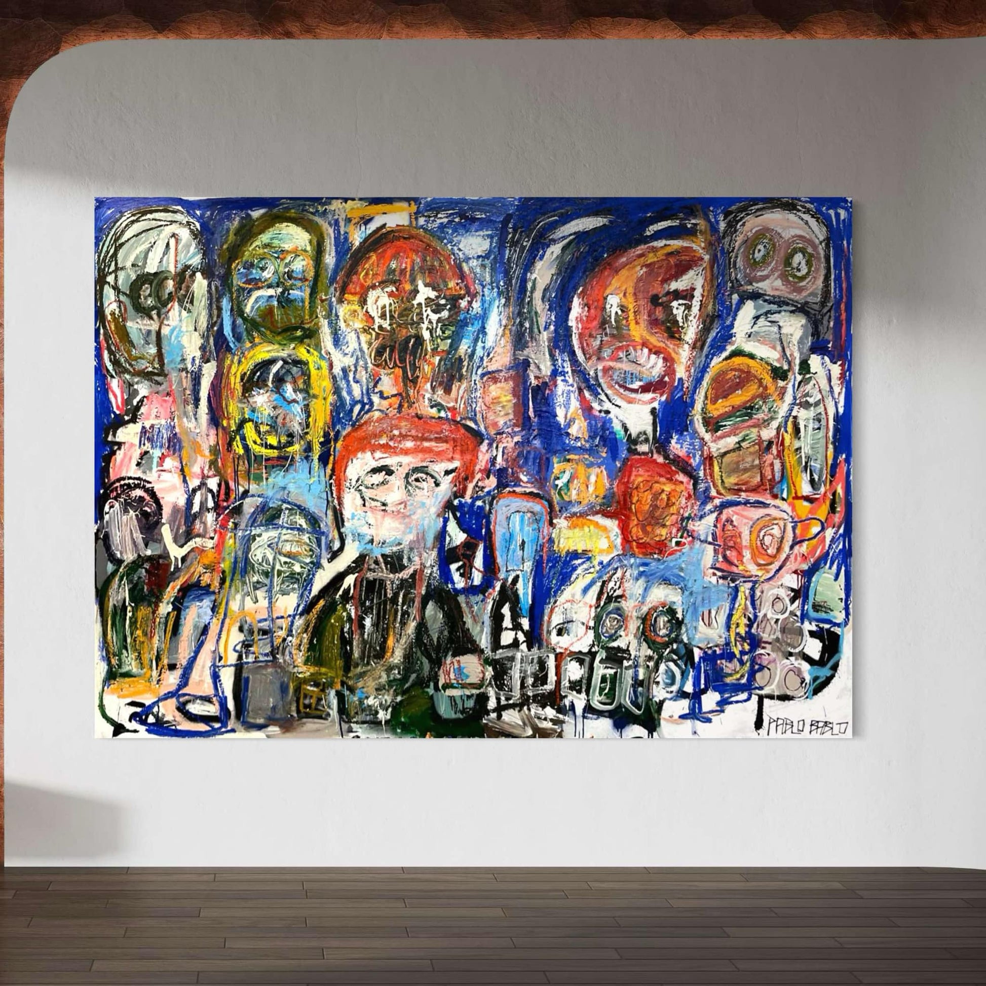 Their forms blur through bold colors and layered textures, unfinished and shifting—like souls still shaping themselves. The painting radiates a sense of otherness and familiarity, mirroring our own search for meaning, connection, and home in a world that never stands still.