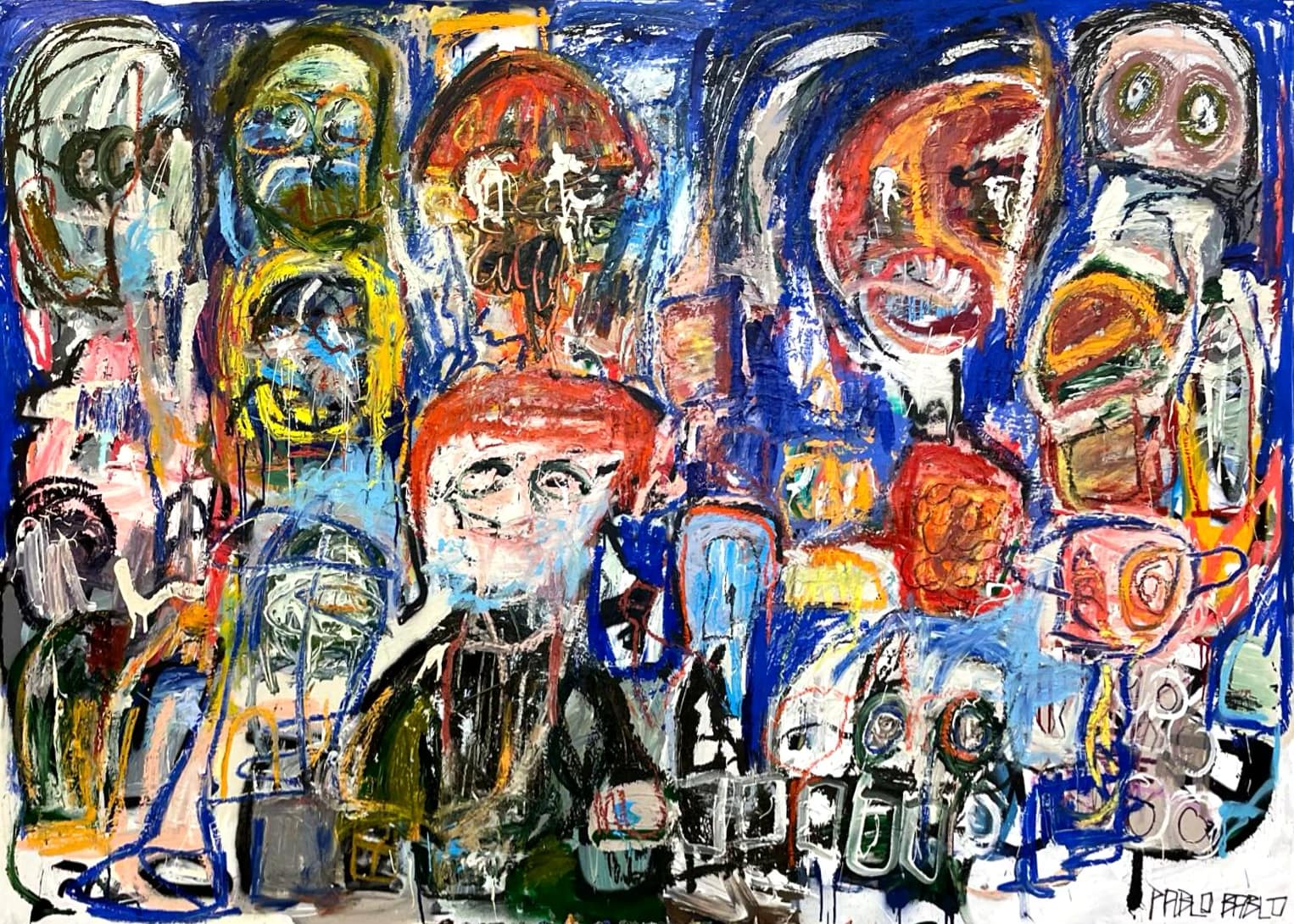 Oil, acrylic, pastels, and spray paint on canvas. 2025. One of a kind.