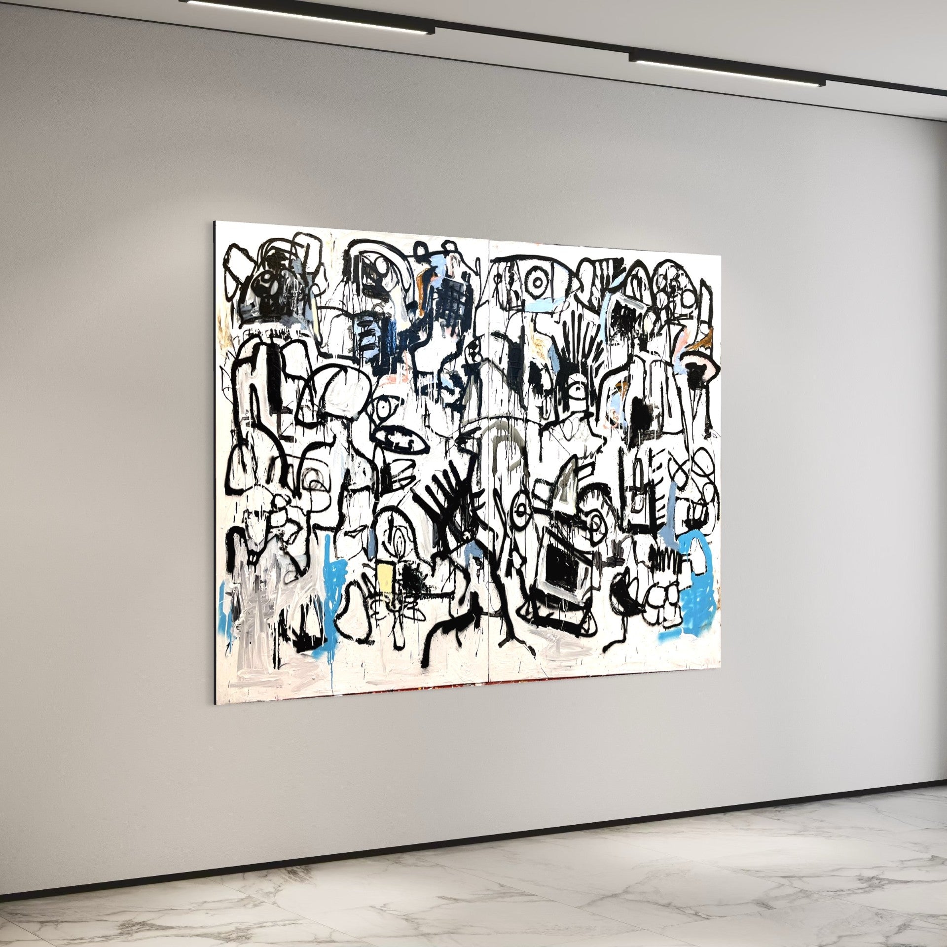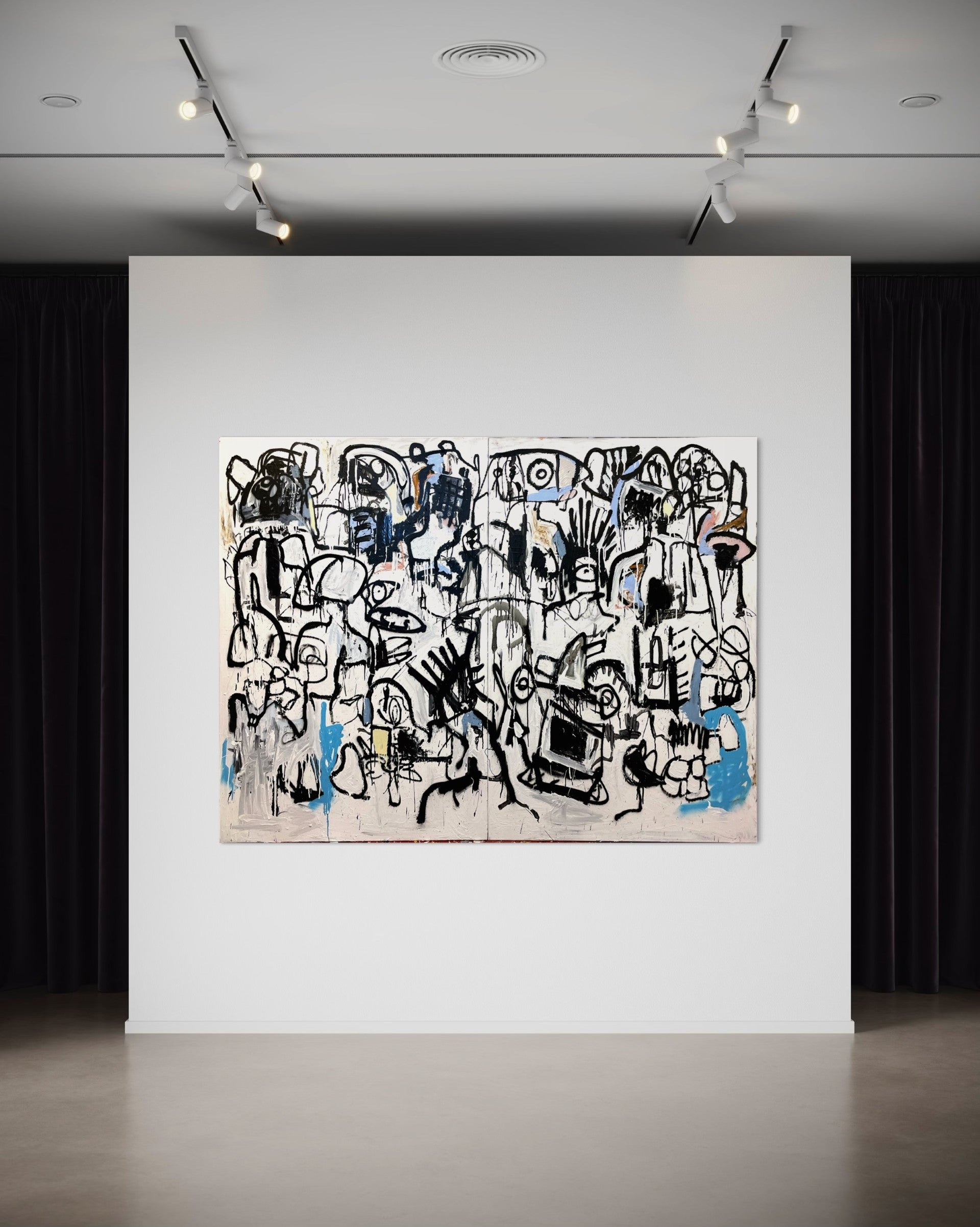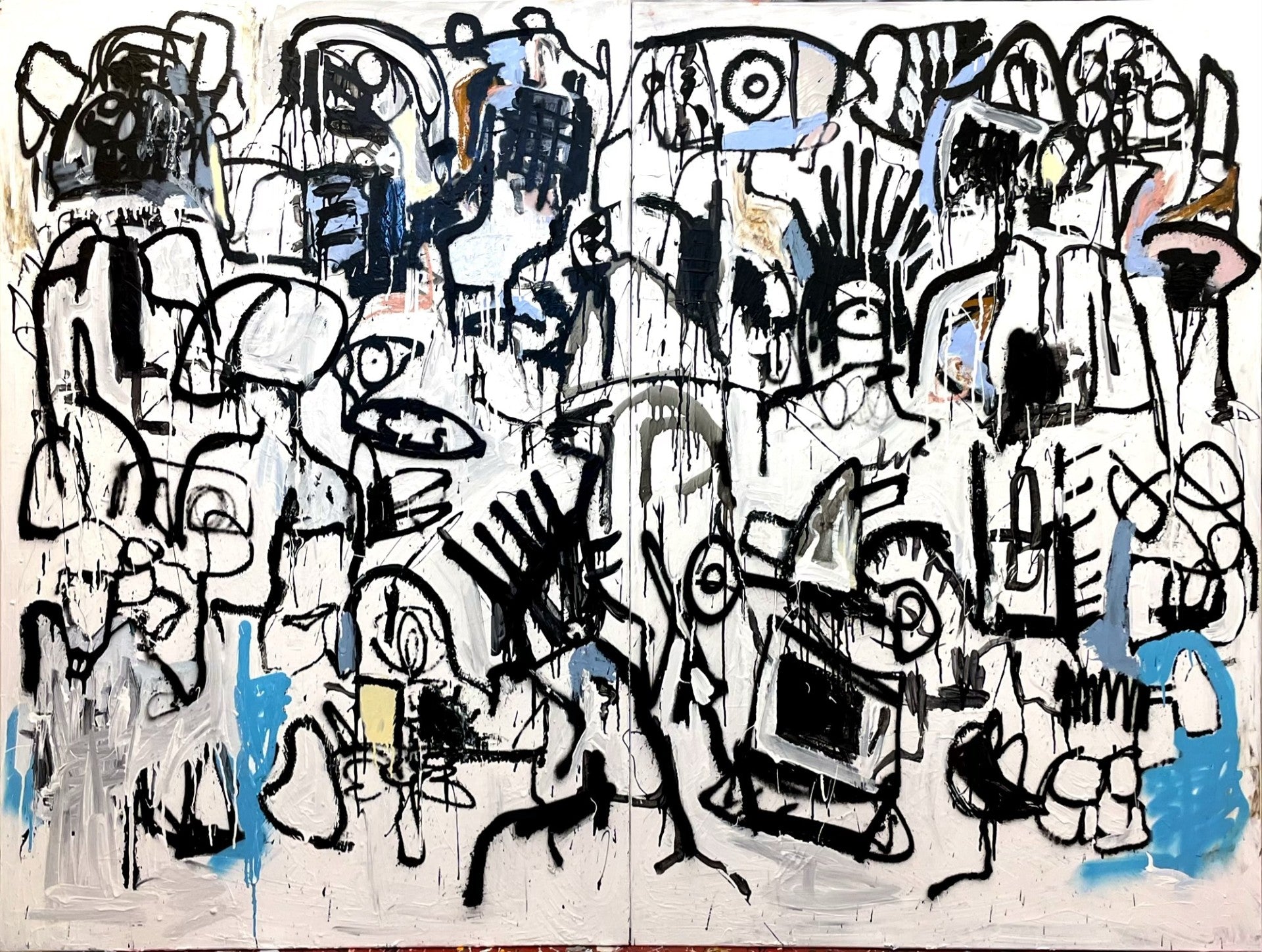 Oil, acrylic, pastels, and spray paint on canvas.