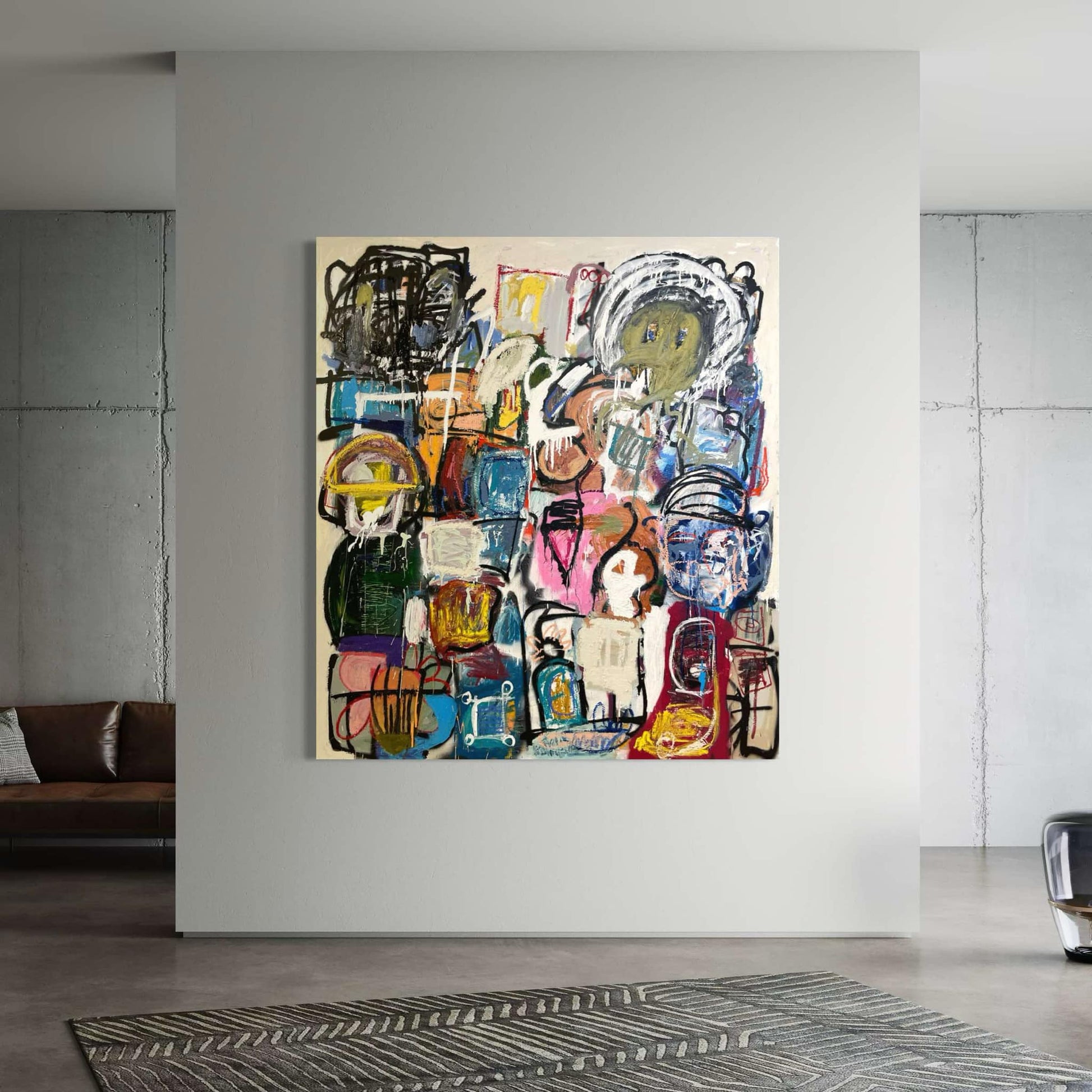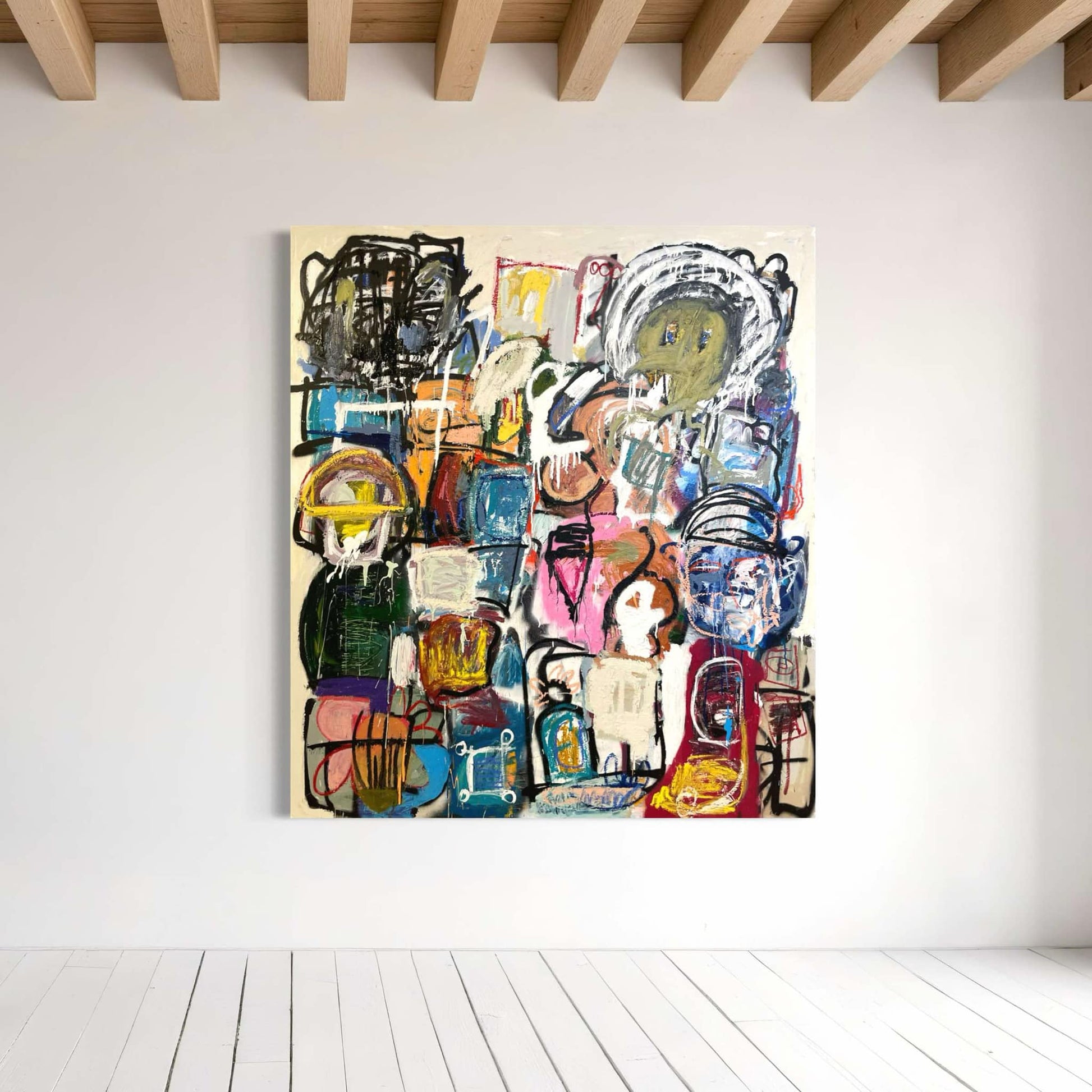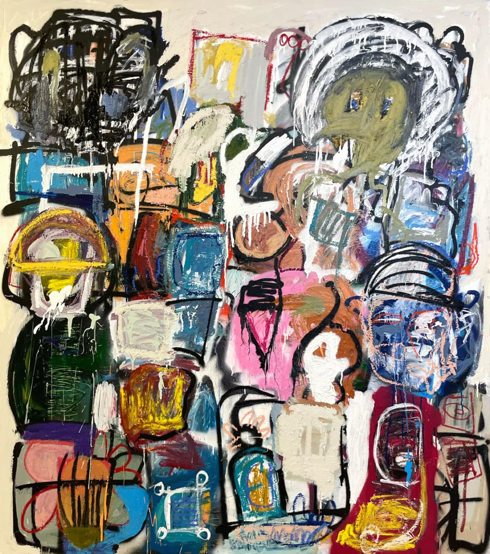 Oil, acrylic, pastels, and spray paint on canvas. 2025. One of a kind.