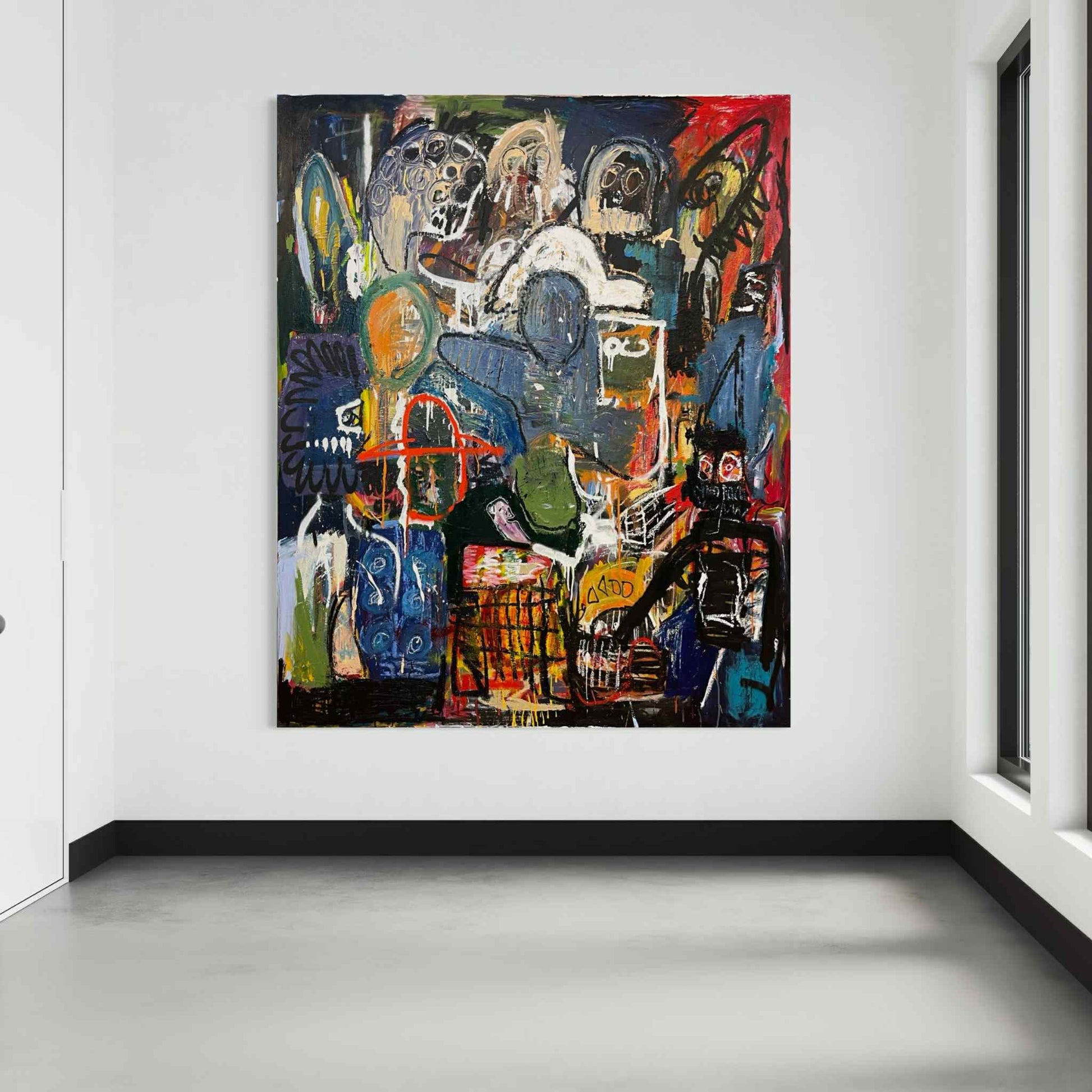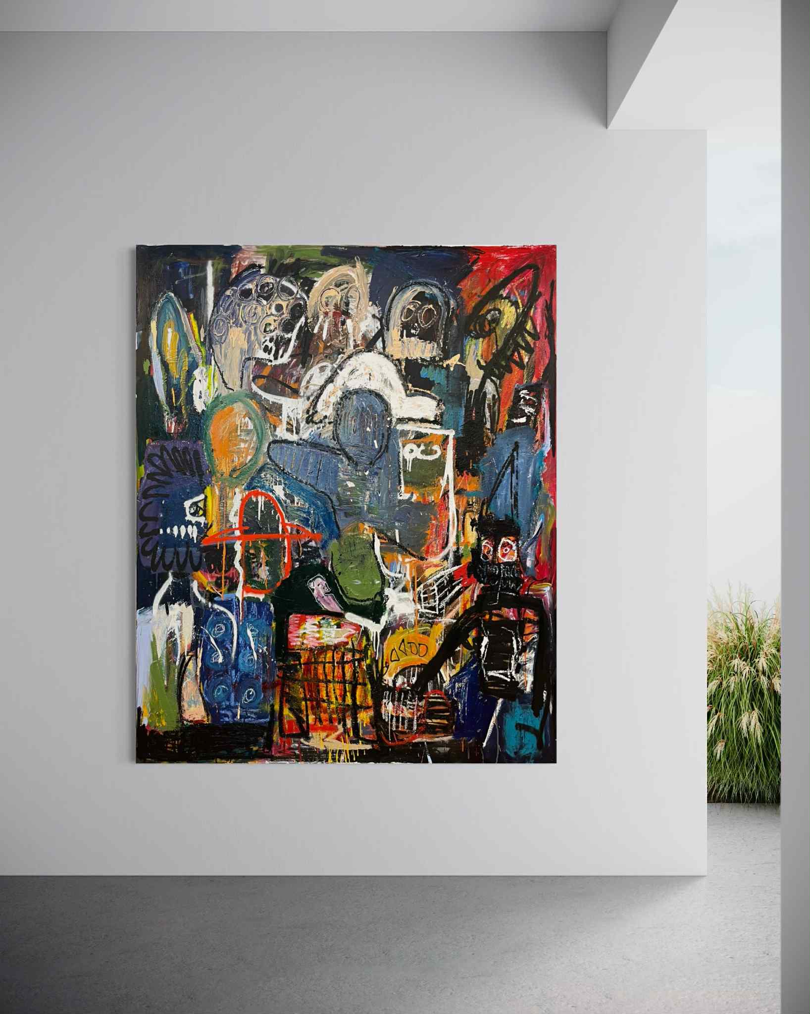 Oil, acrylic, pastels, and spray paint on canvas. 2025. One of a kind.
